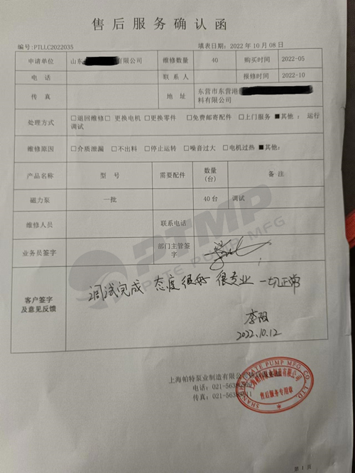 上海帕特泵業為山東一家客戶完成40臺磁力泵的開機調試。